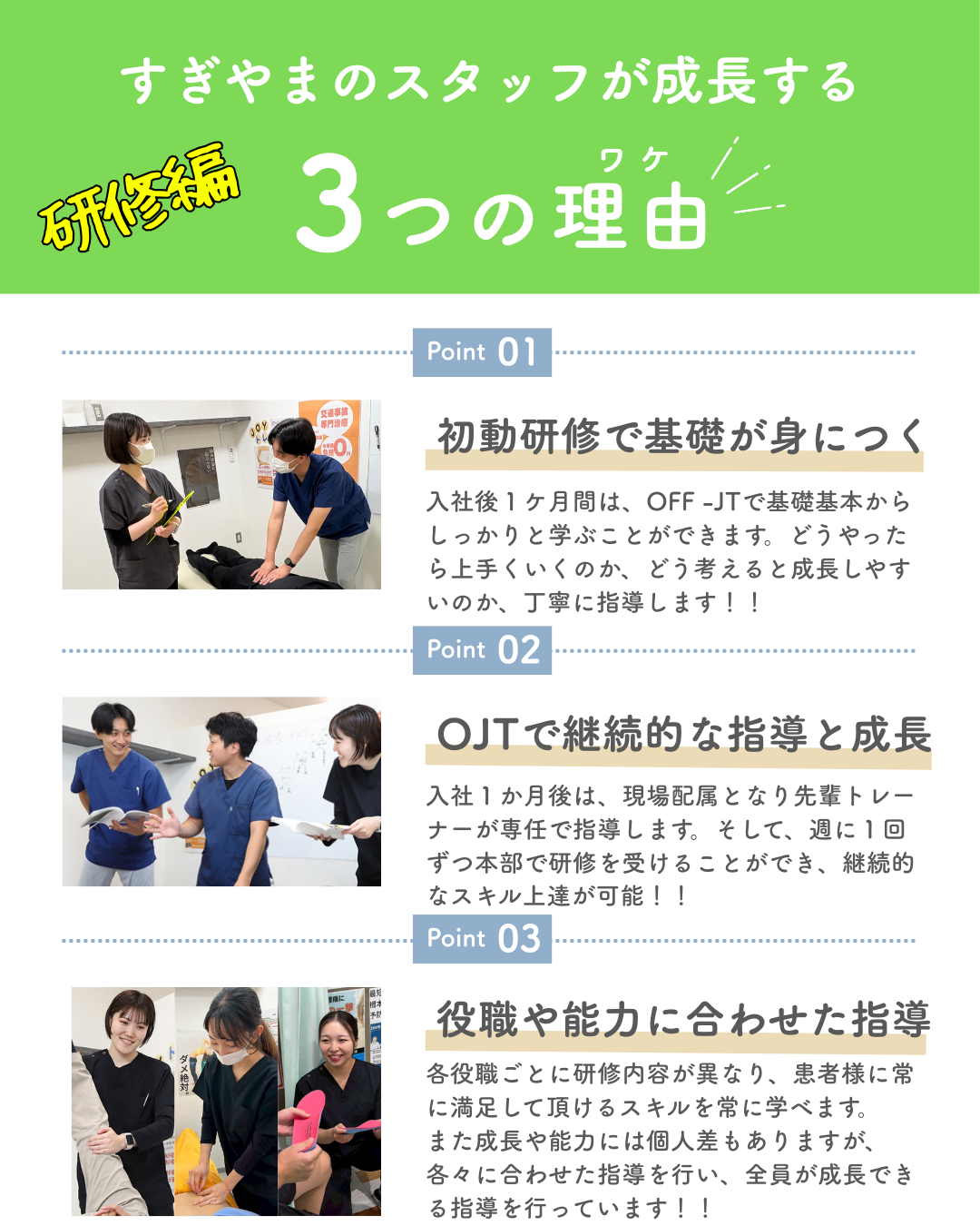 📌 一人ひとりの体に合わせたオーダーメイド施術が特徴で、マニュアル通りではない成長できる環...