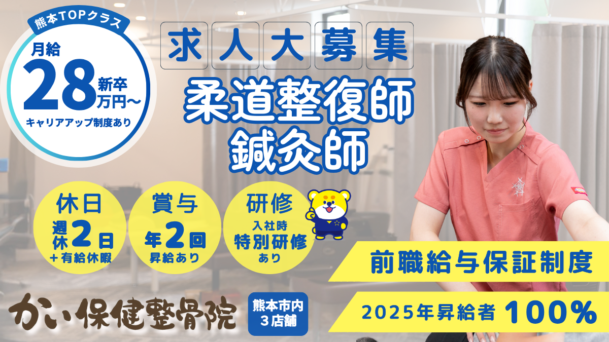 【月給28万〜|週休2日・日曜休|賞与2回】根本改善に本気の整骨院。熊本で選ばれ続ける柔整・鍼灸師へ