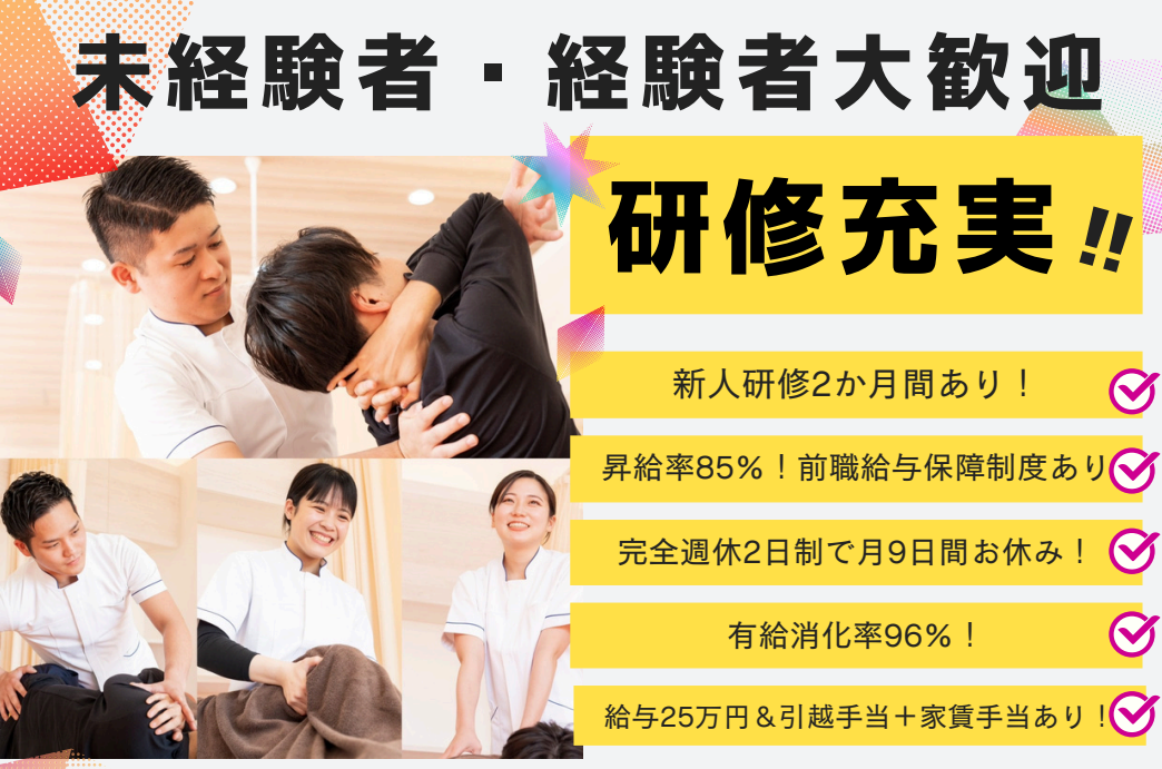 🌟未経験の方は研修2ヶ月間受けた後に治療家デビューとなります💪経験者の方は前職給与保障制度あり!